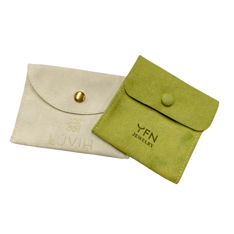 . Borsa per accessori per gioielli in microfibra Beige riciclabile con Logo in rilievo personalizzato e chiusura a scatto